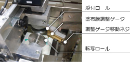 タンク内の基板コーティング剤を転写ロールで持ち上げ、塗布ロールに転写します。 転写された塗布ロールの溶剤を塗布膜調整ゲージで塗布厚さに調整します。